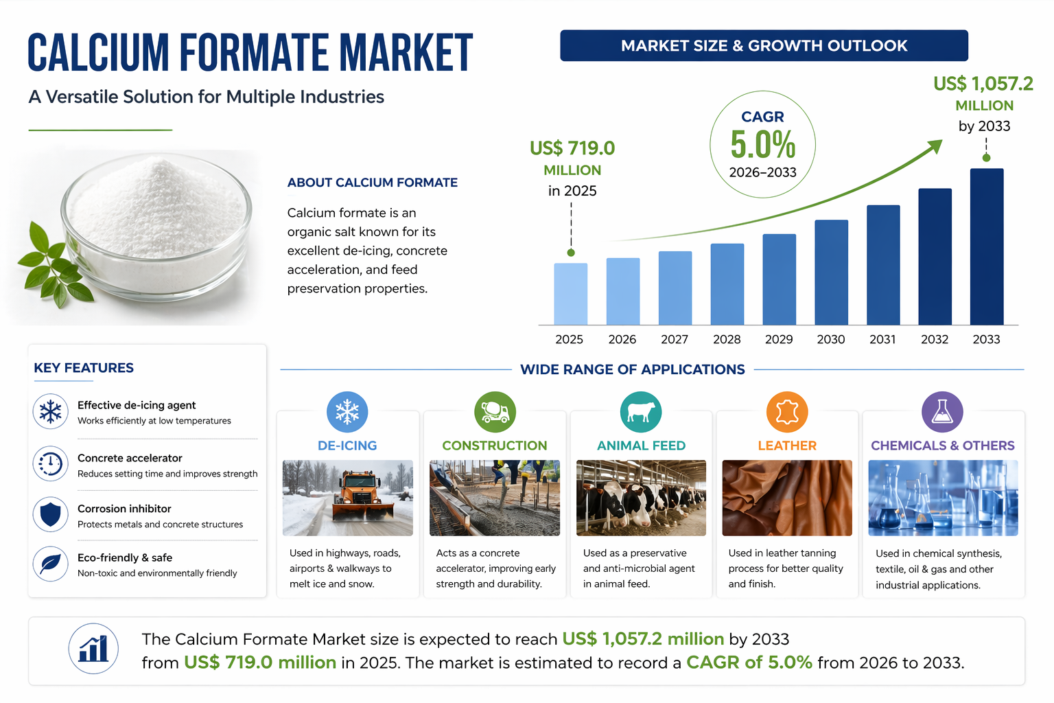 According to recent industry data, the market is entering a phase of robust valuation growth. The Calcium Formate Market size is expected to reach US$ 1,057.2 million by 2033 from US$ 719.0 million in 2025. The market is estimated to record a CAGR of 5.0% from 2026 to 2033. This growth trajectory is fueled by the rapid urbanization in Asia-Pacific and the increasing adoption of eco-friendly de-icing agents in Europe and North America.
