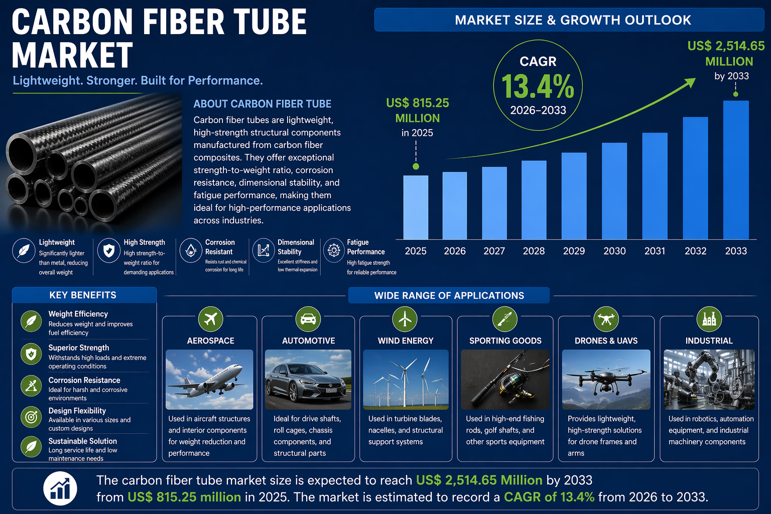 The economic trajectory of this sector reflects its growing importance in modern engineering. The Carbon Fiber Tape Market size is expected to reach US$ 8.28 billion by 2033 from US$ 3.41 billion in 2025. The market is estimated to record a CAGR of 10.4% from 2026 to 2033.