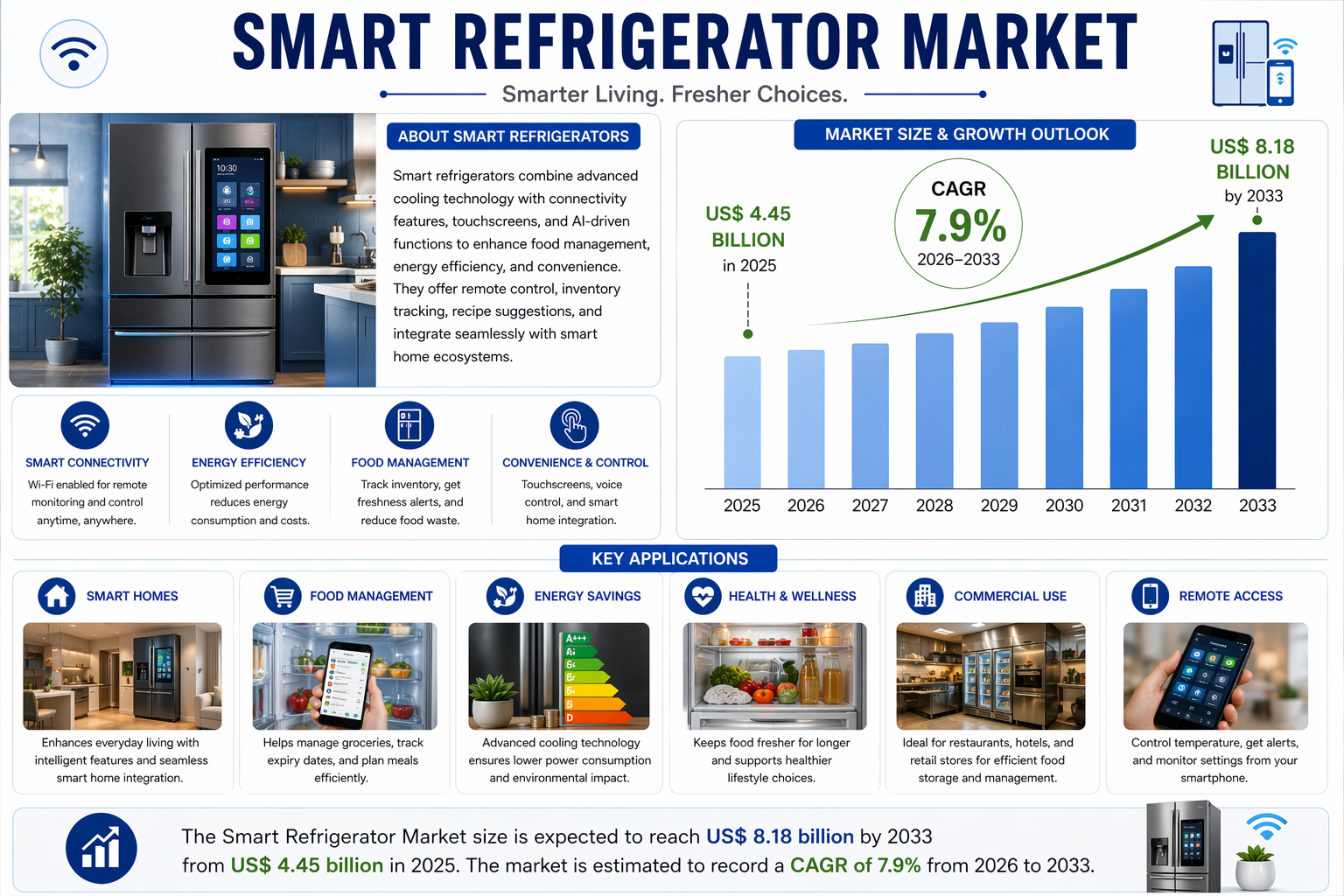 The global market for smart refrigerators is on a robust growth trajectory, fueled by the expansion of smart home ecosystems and rising disposable incomes. The Smart Refrigerator Market size is expected to reach US$ 8.18 billion by 2033 from US$ 4.45 billion in 2025. The market is estimated to record a CAGR of 7.9% from 2026 to 2033.