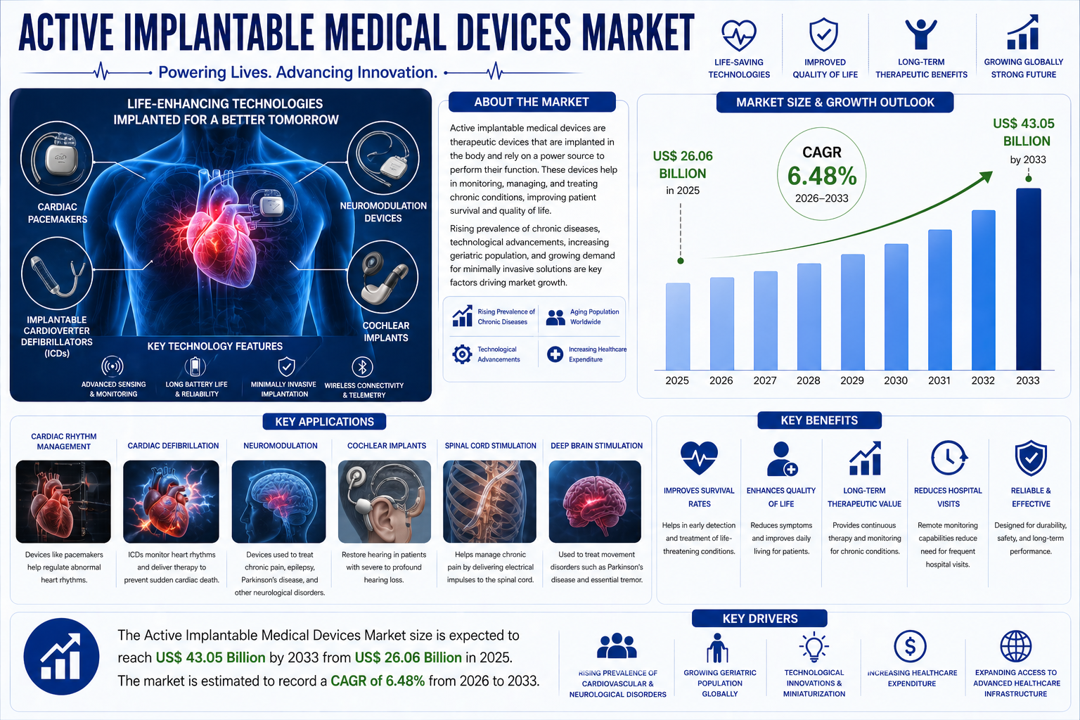 The economic trajectory of this sector is characterized by steady and robust expansion. According to recent market analysis, The Active Implantable Medical Devices Market size is expected to reach US$ 43.05 Billion by 2033 from US$ 26.06 Billion in 2025. The market is estimated to record a CAGR of 6.48% from 2026 to 2033. This growth is a testament to the increasing adoption of advanced surgical procedures and the integration of digital health solutions into implantable technologies.