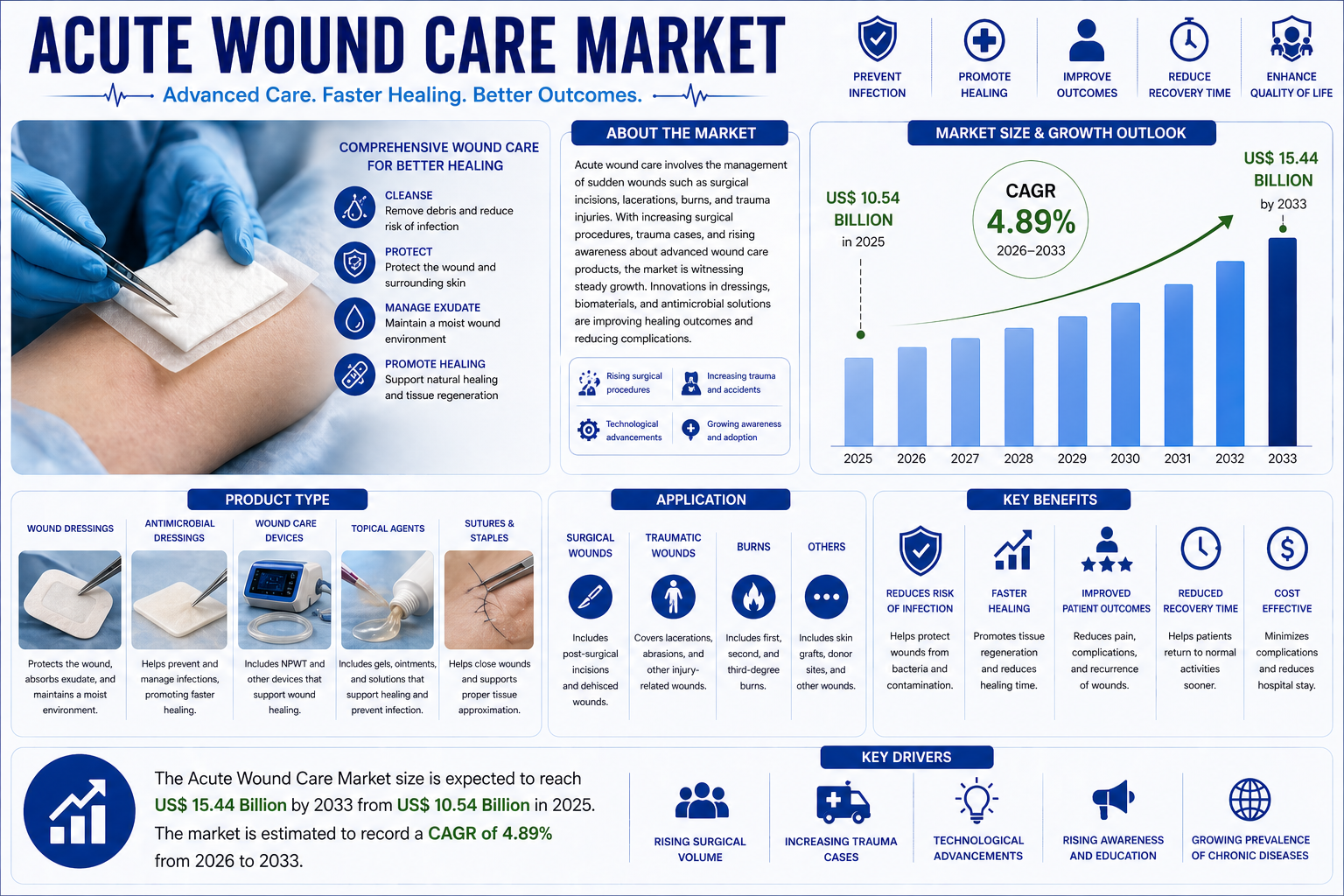 The market is characterized by steady growth and technological integration. The Acute Wound Care Market size is expected to reach US$ 15.44 Billion by 2033 from US$ 10.54 Billion in 2025.The market is estimated to record a CAGR of 4.89% from 2026 to 2033. This growth reflects the increasing adoption of advanced wound dressings over traditional products and a rising shift toward outpatient and home-based wound management.
